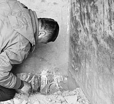 图为文物工作人员正细致地察看一处刚刚从泥土中清理出的壁画。杨正林 摄