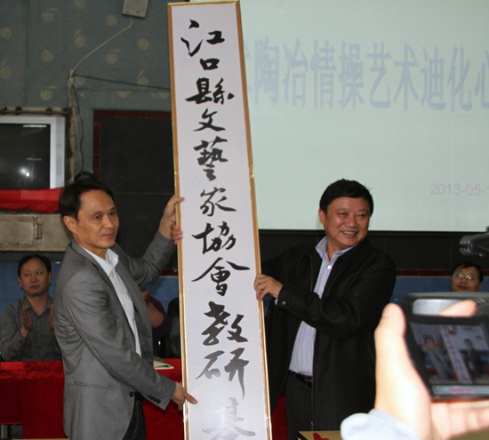 近年来,江口县民族中学校园文化建设取得了显著成绩,涌现出一批在县内外文学艺术领域拔尖人才。为了深化素质教育,陶冶学生的情操,为梵净山文化大发展大繁荣奠定人才基础,县文联和民族中学联合开展文艺作品进校园活动,组织书法、摄影、美术作品在校园巡展。图为县人大副主任梅文海为文艺家协会教研基地授牌。