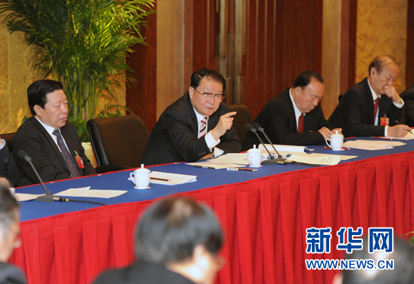 3月4日,中共中央政治局常委李长春看望出席全国政协十一届五次会议的文艺界委员,并参加联组会,同大家共商国是。 新华社记者 谢环驰 摄