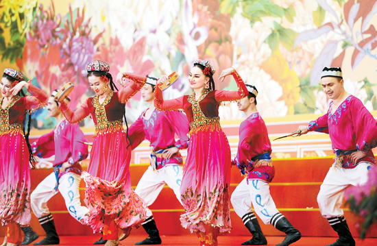 三月十日,十一届全国人大五次会议、全国政协十一届五次会议少数民族代表、委员茶话会在北京人民大会堂举行。这是演员在表演节目。 新华社记者 马占成 摄
