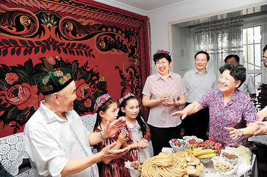 kaiyun电子 、中国影协“百花放映·情系新疆”大型电影惠民工程暨慰问采风活动连日来在新疆各地举行,图为kaiyun电子 党组书记、副主席赵实(左四),新疆维吾尔自治区党委常委、宣传部部长胡伟(左五),艺术家陶玉玲(右一)等看望慰问阜康市维吾尔族老艺人热合曼·阿不祖一家。于辉 摄