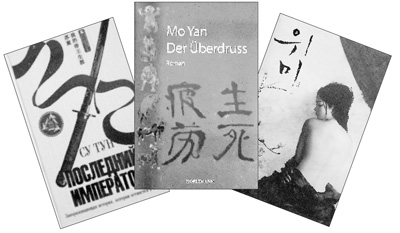 苏童《我的帝王生涯》俄语版封面、莫言《生死疲劳》德语版封面、毕飞宇《玉米》韩语版封面
