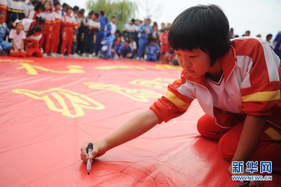 9月17日,山东省乳山市徐家学校学生在“勿忘国耻、爱我中华”的巨型宣传条幅上签名。当日,乳山市徐家学校邀请参加抗战的退伍老兵和驻地边防部队的现役军人走进学校,通过给学生讲解历史知识、宣誓等形式,开展主题为“勿忘国耻、爱我中华”的爱国主义教育活动。新华社发(刘国贤 摄)