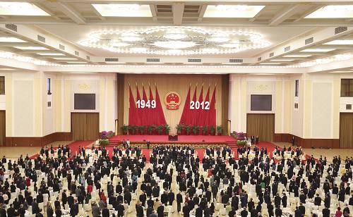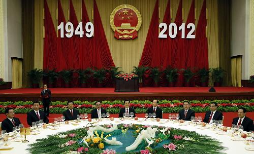 9月29日,国务院在人民大会堂举行盛大招待会,热烈庆祝中华人民共和国成立63周年。胡锦涛、吴邦国、温家宝、贾庆林、李长春、习近平、李克强、贺国强、周永康等党和国家领导人与中外人士欢聚一堂,共庆佳节。新华社记者鞠鹏 摄