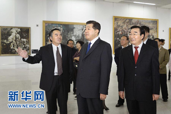 10月8日,中共中央政治局常委、全国政协主席贾庆林来到中国国家博物馆,参观正在这里举办的“迎着曙光——弘扬西柏坡精神陈承齐大型油画展”。 新华社记者 李涛 摄