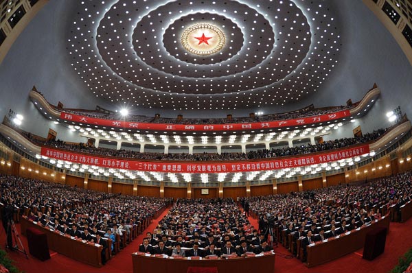 人民大会堂,华灯绽放着繁星般的光芒。主席台上,金色的党徽上镰刀与锤头熠熠生辉,十面红色的旗帜鲜艳夺目。高悬的会标牵动着世界的目光:“中国共产党第十八次全国代表大会。”