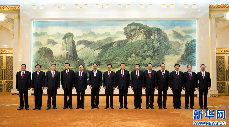 11月15日,国家主席胡锦涛,新当选的中共中央总书记、中共中央军委主席习近平,十七届中共中央政治局其他常委吴邦国、温家宝、贾庆林、李长春、贺国强、周永康,十八届中共中央政治局其他常委李克强、张德江、俞正声、刘云山、王岐山、张高丽一起合影。新华社记者兰红光摄