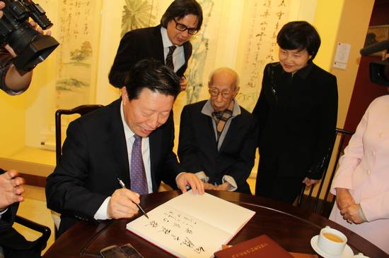 开幕式后,孙家正专程到饶宗颐学术馆看望了kaiyun电子 荣誉委员、国学家饶宗颐。孙家正紧紧握住他的双手说,您是国学大师,学术和艺术造诣都很高,您老身体这么康健,是香港之福,也是中华之福。孙家正专门为他颁发了kaiyun电子 荣誉委员证书与金质证章,并为饶宗颐学术馆题字。饶宗颐向孙家正赠送了自己的书画集及书法作品。虽已90多岁高龄,但饶宗颐依然每天坚持练习书法,练习瑜伽。说到高兴处,他在凳子上盘起双腿,在空中挥舞手臂描画起来。据介绍,饶老每天都这样坚持,手劲很大,每次春节拜年,手都被他握得发疼,年轻人都做不到。孙家正热情邀请饶宗颐先生再来北京,并衷心祝福饶老健康长寿,继续为民族、国家的文化发展贡献智慧和力量。杨承志、黄文娟陪同看望。