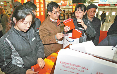 11月21日,工作人员在帮助读者整理购买党的十八大文件及学习辅导读物。当日,由人民出版社出版的党的十八大文件及学习辅导读物首发式在北京图书大厦举行。李方宇摄(新华社发)