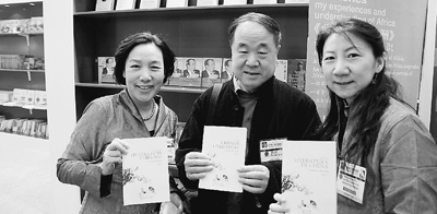 2012年伦敦书展期间,莫言在中国外文局展台前手持《中国文学》与该系列图书的编辑合影