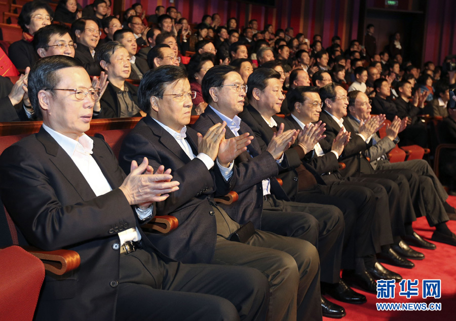12月30日晚,2013年新年京剧晚会在北京国家大剧院举行。党和国家领导人习近平、李克强、张德江、俞正声、刘云山、王岐山、张高丽,与首都近千名群众一起观看演出,喜迎新年的到来。新华社记者 丁林 摄