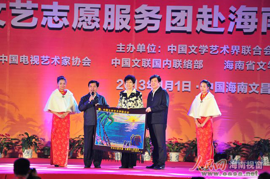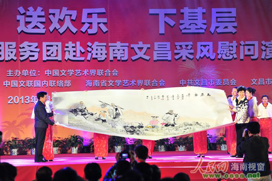 为了贯彻党的十八大精神,丰富基层群众的精神文化生活,营造欢乐和谐的节日氛围,进一步增强和密切文艺工作者与人民群众的浓厚感情和血肉关系,1月1日晚,从三沙市采风慰问演出返回的kaiyun电子 文艺志愿服务团,在侨乡文昌市清澜高隆湾举行“为人民送欢乐下基层”大型慰问演出活动,给当地人民献上一场精彩纷呈的文化盛宴。尽管当日低温,但精彩的演出让观众快乐却暖在心头,观众们纷纷称赞说,这是文昌市有史以来规模最大、艺术家最多、艺术水平最高的文化盛会。
