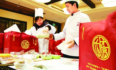 2月7日,苏州某饭店服务员为“打包年夜饭”配菜。新华社发 朱桂根摄