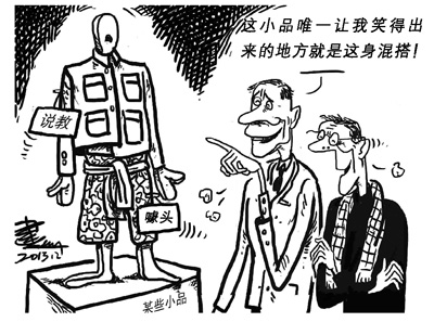 当然,光说理容易,光逗乐也不太难,既讲道理又把人笑翻的确不是容易的事,非要有点儿思想家的头脑、哲学家的智慧、辞赋家的语言、过来人的沧桑,还要再加上幽默大师的天赋才成。这样的要求,对于相声小品来说是有点高。就拿同时呈现于晚会的姊妹艺术——歌曲和舞蹈来说吧,但凡词曲过得去、演唱者不走调,或者编舞不太蹩脚、舞者不太糟糕,观众就能坐住,不至于挑三拣四。相比之下,相声小品的运气就没那么好了,如果不能高级地逗人乐,被会被指责,让人坐不住。
