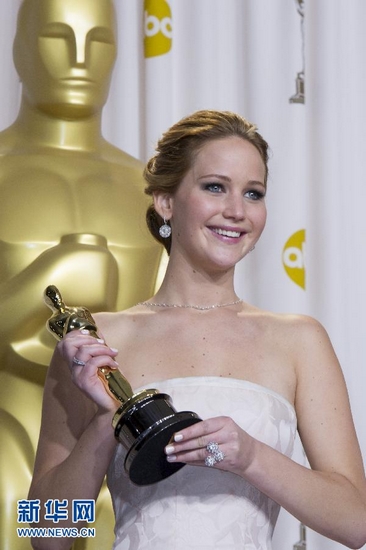 2月24日,在美国好莱坞杜比剧院,获最佳女主角奖的詹妮弗·劳伦斯在后台展示所获奖杯。第85届当天在美国洛杉矶好莱坞杜比剧院举行。