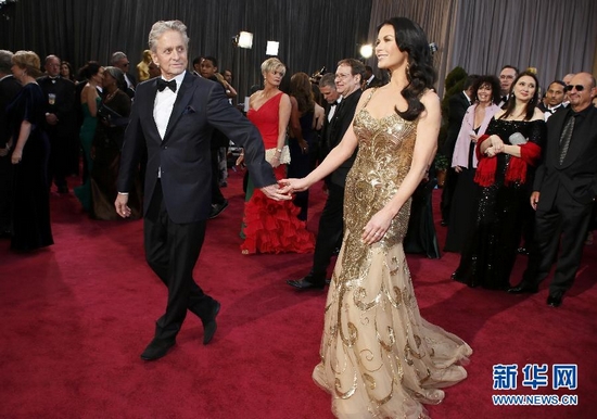 2月24日,在美国好莱坞举行的第85届奥斯卡奖颁奖典礼开始前, 影星迈克尔·道格拉斯(中)与妻子凯瑟琳·泽塔·琼斯(右)亮相红地毯。当天,第85届在好莱坞举行。