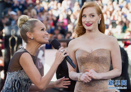 2月24日,在美国好莱坞举行的第85届奥斯卡奖颁奖典礼开始前,演员杰西卡·查斯坦(右)亮相红地毯。当天,第85届在好莱坞举行。