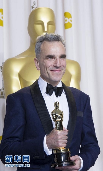 2月24日,在美国好莱坞杜比剧院,获最佳男主角奖的演员丹尼尔·戴-刘易斯在后台展示所获奖杯。第85届当天在美国洛杉矶好莱坞杜比剧院举行。