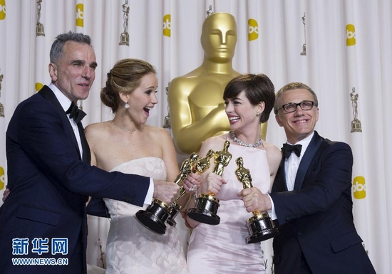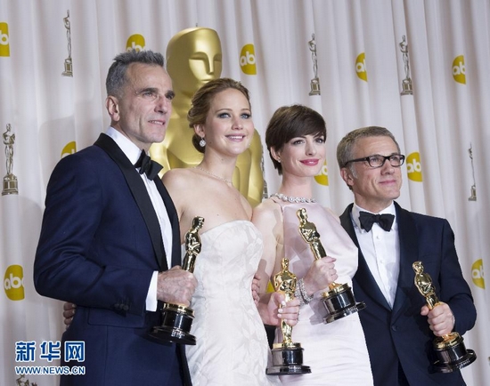 2月24日,在美国好莱坞杜比剧院,获最佳男主角奖的丹尼尔·戴-刘易斯、获最佳女主角奖的詹妮弗·劳伦斯、获最佳女配角奖的安妮·海瑟薇及获最佳男配角奖的克里斯托弗·华尔兹(从左至右)在后台合影。第85届当天在美国洛杉矶好莱坞杜比剧院举行。