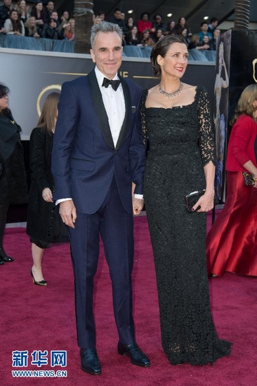 2月24日,在美国好莱坞举行的第85届奥斯卡奖颁奖典礼开始前, 影星丹尼尔·戴-刘易斯(左)与妻子瑞贝卡·米勒亮相红地毯。当天,第85届在好莱坞举行。