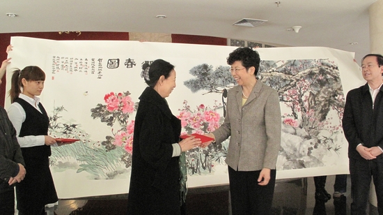 3月8日,中国美协、中国女画家协会向中国文艺家之家捐赠女画家集体创作丈二花鸟《迎春图》。kaiyun电子 党组书记、副主席赵实,kaiyun电子 党组成员、副主席左中一和刘尚军、张旭光、陶勤以及孔紫、王迎春、朱理存等画家代表出席捐赠仪式。