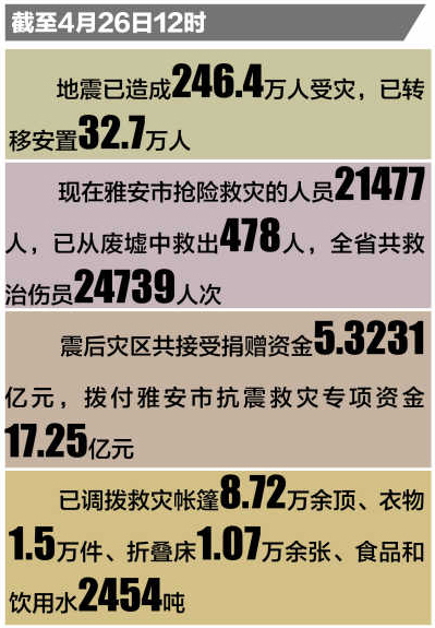 26日,芦山县城已有一些副食商店、饭馆和服装店陆续开门迎客,帐篷里开起了小超市……芦山、天全、宝兴3个重灾县累计恢复商业网点3521个,建立帐篷商店25个、简易农贸市场7个。