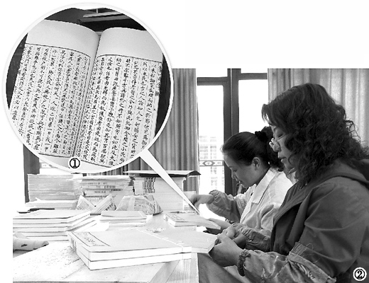 图①:扬州书局再版的《四库全书》部分样书。 图②:装订车间,工作人员正在完成线装书成品前的最后工序。 人民日报记者 姚雪青摄 |