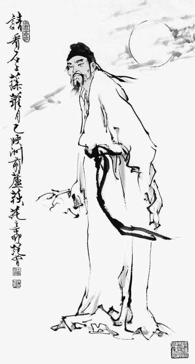 岁月的风轻轻拂过,留下先知先贤的空谷足音。在墨迹斑斑的画布背后,似乎有无数的身影在跃动,他们长袖舞动,衣袂飘飘,裹挟着数千年的烟云浩渺、风雷激荡。在这里,刚直不阿的钟馗、清静无为的老子、仙风道骨的庄子、高标自持的屈原、建安风骨的曹操、倜傥风流的李白、沉着雄浑的杜甫、慷慨悲凉的苏东坡、疏淡峻逸的柳宗元、嬉笑怒骂的蒲松龄、豪放不羁的曹雪芹……恍然可见他们倜傥的身影,听到他们朗朗的笑声。毫无疑问,范曾在作画之时,将自己也画了进去,他忘不了成长中的青春恣肆、苦难中的坚韧不拔,也忘不了狭路相逢的寒霜、华山论剑的雄心。