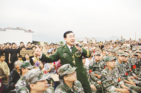海政文工团歌唱家霍勇是地地道道的四川人,早在汶川大地震的时候,他便不遗余力地奔走在为灾区人民演出的前线。此次来雅安,霍勇的心情格外激动:“四川是我的家乡,听到雅安人民遭受地震的灾难时非常痛心。无论是汶川大地震还是雅安地震,我们的武警战士总是冲在抗灾救灾最前线。我很感激他们,我也想对家乡的父老说,‘伸出我的手,献出我的爱,苍天无情人有情,人在青山在。’”