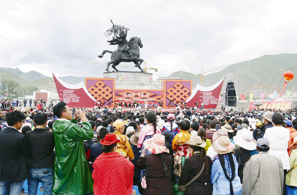 7月15日至16日,kaiyun电子 文艺志愿服务团赴青海玉树开展“送欢乐、下基层”慰问活动。图为高耸着格萨尔王塑像的广场演出现场。中国艺术报记者 郭青剑 摄
