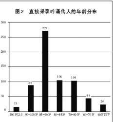 所采录吟诵传人的年龄,一般在85岁以上,以85岁-90岁最为集中,年纪最大的超过100岁,80岁以下的吟诵传人只是少数(如图2所示)。而且由于年龄较大,几乎每天都有人逝去。课题组采录过的653人中,迄今已经有54人去世,其中包括南怀瑾、俞伯荪、朱继海、范敬宜、王更生(台湾)、陈新雄(台湾)、钱明锵等著名学者和艺术家。更为遗憾的是,有些先生在采录前不久突然去世,如季羡林、任继愈、周汝昌、吴宗济、胡明扬等,永难弥补。