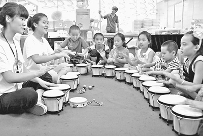 8月1日,在宁夏银川举办的第三届中国西部童博会上,孩子们正在与展馆老师们进行音乐互动。童博会举办以来,主办方通过大型嘉年华游艺设施、互动教育、文艺表演等一系列少儿文艺活动,为暑期的孩子们奉上丰盛的文化娱乐大餐,成为孩子们消暑纳凉,游戏休闲的好去处。