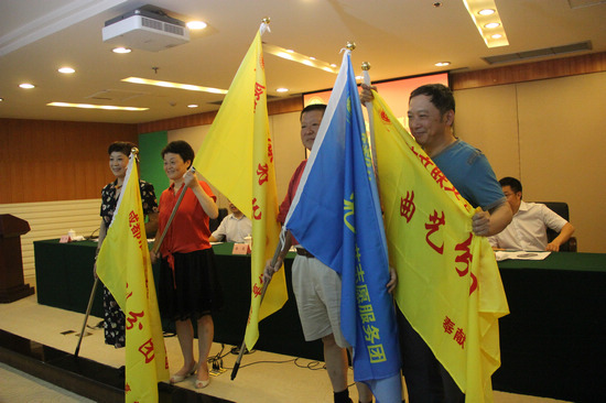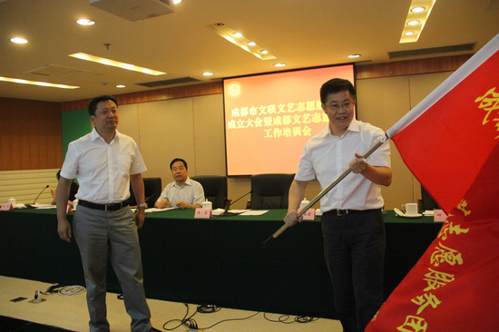 kaiyun电子 文艺志愿服务中心副主任廖恳(左)向成都市文联授团旗