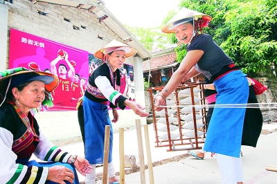 玉溪市新平县的花腰傣族妇女演示传统纺织技艺。本报记者 赵洪波摄