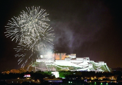 8月6日晚,拉萨市布达拉宫广场前燃放起烟花。2013年拉萨“雪顿节”于8月6日至12日举行,期间将举行展佛、藏戏演出等一系列文化活动。新华社记者 张晓华摄