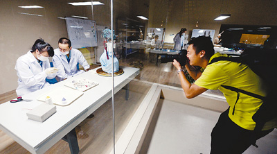 8月20日,陕西历史博物馆,游客正在现场观看工作人员修复清代点翠凤冠。当日,该馆举办“巧手良医——陕西历史博物馆文物保护修复工作展”,邀请公众全程体验文物保护修复工作。