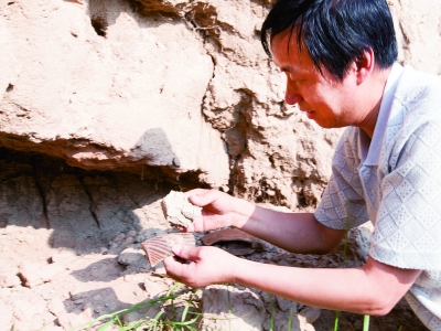 8月23日,甘肃省定西市马家窑文化研究院工作人员,在定西市安定区香泉镇云山村堡子坪一处窑坑遗迹发现窑壁及火道遗迹。该研究院在此地同时发现14处同类遗迹,这是首次发现马家窑文化(距今5300~4200年)如此集中的窑坑遗存。 本报记者 程伟光摄