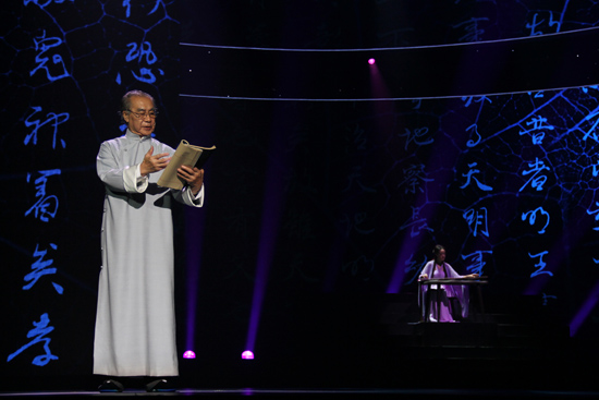 “夫孝,天之经也,地之义也,民之行也。”“夫孝,德之本也,教之所由生也。”……蓝底白字、跌宕遒劲的《孝经》书法背景的舞台侧畔,依稀现出一清丽女子轻拨古琴;而另一端,身着一袭长袍,手持泛黄简书,著名播音艺术家方明倾情朗诵《孝经·三才章》《孝经·开宗明义章》原文,以此为上下篇开篇。顿挫铿锵、深沉厚重的吟诵,句句叩击心灵,也内在统贯着整个咏诵会。