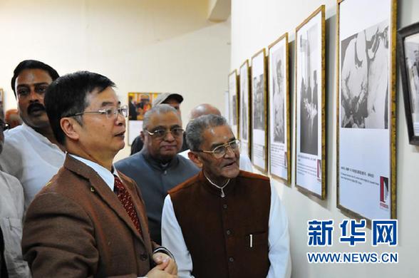 9月1日,在印度班加罗尔,中国驻孟买总领事刘友法(前左)和印度前内阁部长拉贾谢卡兰参观图片展。当日,“新华影廊”纪念柯棣华参加中国抗日战争75周年图片展在印度卡纳塔克邦首府班加罗尔开展,集中展示柯棣华生平和各种纪念活动照片,缅怀这位外国友人增进中印交流和友谊的事迹。 新华社记者 赵旭 摄