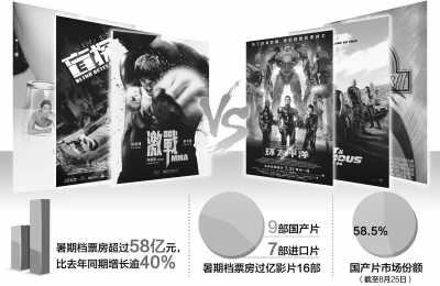 截至8月25日,国产影片市场份额虽较上半年62%的水平有所下滑,但仍高达58.5%。而在暑期档16部票房过亿的影片中,包括9部国产影片和7部进口影片。这一系列数字,显示出中国电影在与进口影片的市场较量中,正迎来一个重要的拐点——从过去完全被动的局面,转向在本土市场获得与好莱坞抗衡的竞争实力,从而基本告别了持续多年的低迷期。