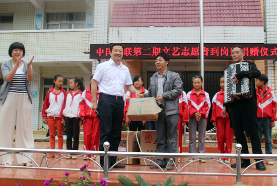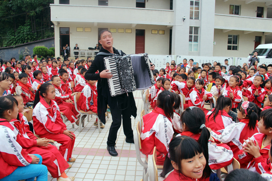 手风琴演奏家杨帆为文艺支教的2所学校捐助了6台手风琴。在志愿者到岗活动现场,杨帆的即兴演奏为学校的老师及孩子们带去了欢乐,更赢得了热烈的掌声。