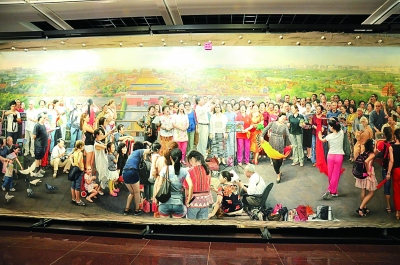 油画作品《景山放歌》,以极其逼真细腻的手法描绘了几组乐在其中的人物:正在练谱子的青年,翩翩起舞的大姐,以及背着孩子、举着摄像机的外国游客,画面里的人物多达200人,每人形态各异。在远处恢弘的故宫建筑群映衬下,栩栩如生的北京当代生活扑面而来。60多岁的作者何绍教也不是北京人,他为了描绘眼中的“幸福北京人”,真实再现北京老百姓在公园唱歌、跳舞欢乐融融的场景,和学生张之琦多次到北京的天坛、景山、紫竹院等公园采风,画中的很多人物都实有其人。
