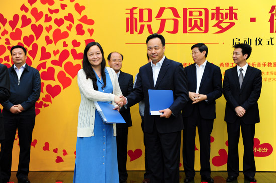 中国文艺志愿者协会、中国文学艺术基金会等实施单位联络中国建设银行等单位达成协议,共同建立了“积分圆梦·微公益”捐赠平台,建行龙卡持卡人可将积分兑换为公益捐赠资金,所获资金将在中国文学艺术基金会设立专项基金开展乡村艺术教师培训工作,主要用于乡村艺术教师集中培训食宿、交通、后期成果展示等费用。首期捐赠项目包括每1250万积分建成一个音乐教室的“希望工程——快乐音乐教室”公益项目,以及每20000积分捐助一个教师一小时培训的“乡村音乐艺术教师培训”计划。持卡人每捐赠500积分,就等于向这个公益项目捐赠1元钱。