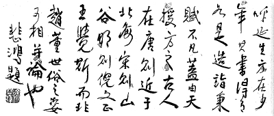 徐悲鸿对王学仲说:“‘怪’字的含义有贬也有褒,‘扬州八怪’不也是‘怪’吗?你的书画有一些文人画的趣味,但还要下深功夫,形成你个人的风貌。”徐悲鸿挥毫勉励他:“呼延生方在少年,其书得有如是造诣,秉(禀)赋不凡,盖由天授,方之古人,在唐则近于北海,宋则山谷,明则倪文正、王觉斯,而非赵、董世俗之姿可相并论也。”