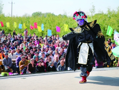十月十一日,河北省河间市景和镇石灰屯村的村民欣赏川剧《变脸》时发出欢快的笑声。当日,北京市意馨明辉国际文化艺术发展有限公司艺术团二百多名演职人员将一台文化大戏送到了该村,受到了村民的热烈欢迎。