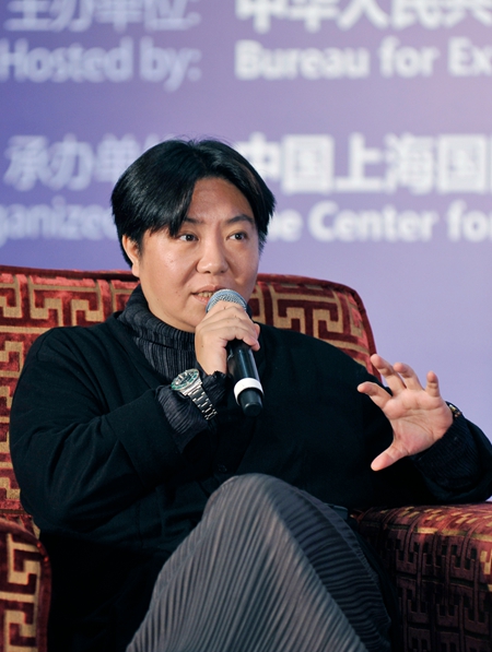 10月18日第十五届上海国际艺术节盛大开幕。本届艺术节的主旨论坛是“包容、开放与创新——尊重文化多样性,促进文化间对话”,图为著名话剧导演田沁鑫在论坛上发言。她带来上海国际艺术节的委约作品《青蛇》演出。中国文艺网张悦摄