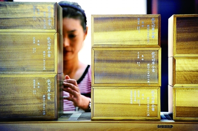 10月18日,工作人员在整理部分已经印制完成的原大原色原样版《四库全书》(文津阁本)。两套由商务印书馆出版的《四库全书》(文津阁本)原大原色原样版将于本月底印制完成。该套书籍印制历时约一年半,所用材质在现有条件下最大限度地接近原书,尽可能再现《四库全书》(文津阁本)的原书原貌。 《四库全书》共抄成7部,包括“内廷四阁”和“江浙三阁”,其中大多已毁于战火。原藏于承德避暑山庄文津阁,现在由国家图书馆收藏的“文津阁本”是保存最全的一部。