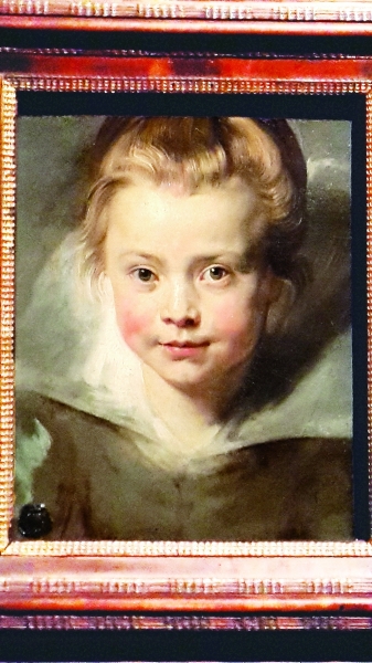 展厅里有一幅只有B4纸那么大的油画,却“吸”住了每一位从它面前走过的观众——这就是《克拉拉·赛琳娜·鲁本斯的肖像》,欧洲艺术史上最动人的一幅肖像画。这件作品是鲁本斯1616年创作的,描绘的是他5岁的长女克拉拉·赛琳娜。在白色衣领的衬托下,女孩儿脸颊粉红,绿色的大眼睛率真地盯着画面之外,那张写满稚嫩、天真无邪、讨人喜爱的脸庞栩栩如生,而浓浓的父爱也在每一笔线条、每一块色彩中荡漾,打动每一位观者。