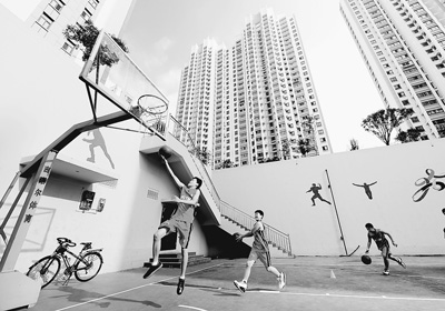 图为在山东省枣庄市,孩子们在社区篮球场打篮球。