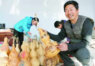 缘何小小的葫芦一“变脸”就身价倍增?就因为将葫芦融入了文化元素。从2009年起,方以忠就开始尝试着在葫芦上雕画、烙画,让山水画、各种动物、人物逐渐“走”上了葫芦。如今,带有当地浓郁文化色彩的“无棣八大景”又开始走上了葫芦,深受社会各界喜爱并收藏。 蒋惠庆摄